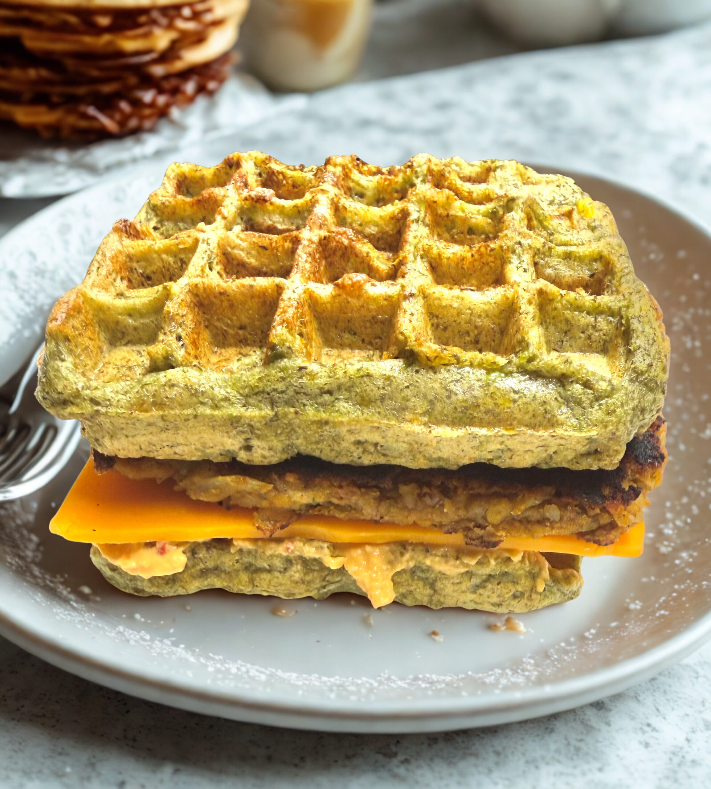 Crispy high protein waffle base with filled health patty along with vegan or dairy cheese, hummus and apricot sauce.